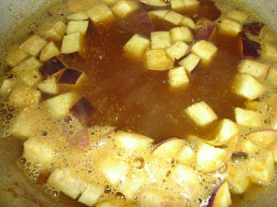 1.Cut the brinjal into medium sizes and onion to cubes.In a wok take water and add the turmeric powder,salt,jaggery.Once the starts boiling add the brinjal and cook till tender.